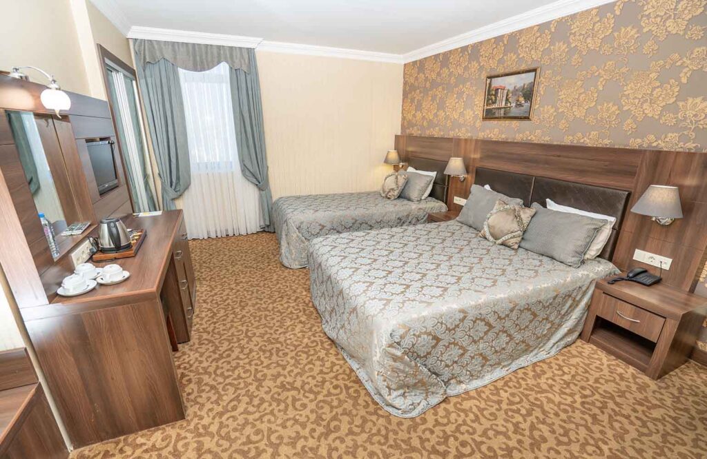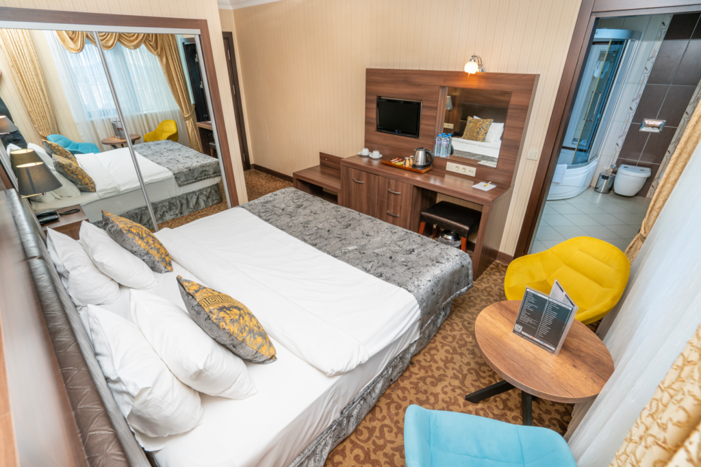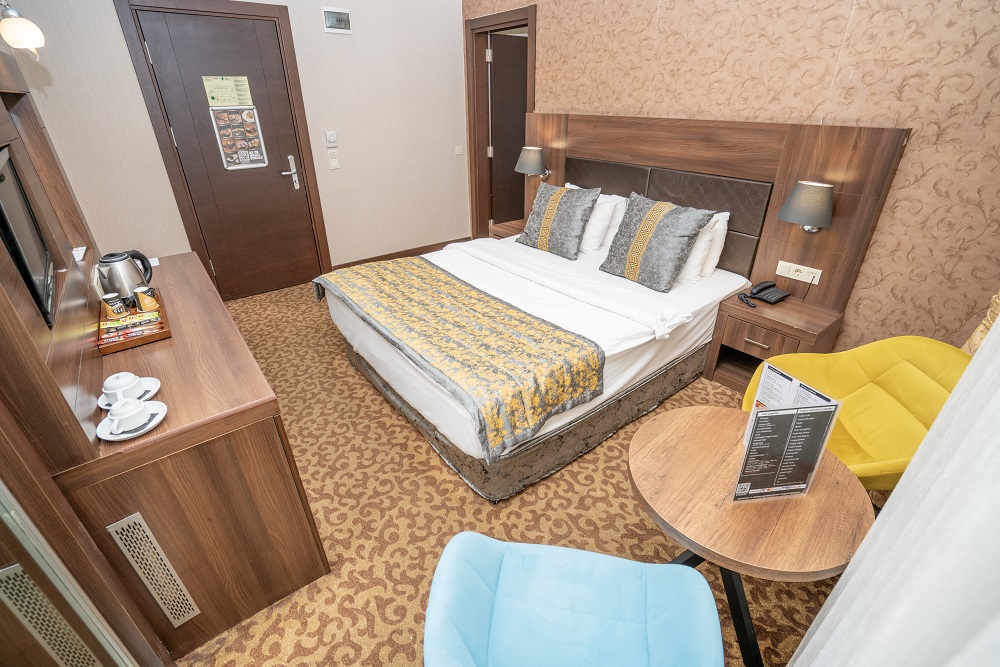 1 Büyük yatak veya 2 Tek kişilik (Twin) yatak, 20 m2 büyüklüğe sahip Odalarımız, küvet veya duşa kabinlidir. Oturma alanı, Internet, Uydu TV, Ketlle, çay ve kahve, Ütü, Minibar, Merkezi klima, Acil durum çıkış planı, Açılabilir pencere, Saç kurutma makinesi, Oda kasası.