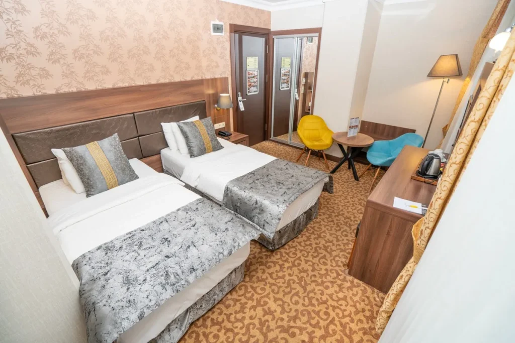 Geniş ve ferah odalarda rahat konaklama ve verimli çalışma ortamını aynı anda bulacaksınız. Bu odaların özellikleri şunlardır: 2 adet tek kişilik yatak seçeneği, laptop sığabilen ölçülerde güvenlik kasası, yüksek hızda ücretsiz kablolu ve kablosuz internet, 1000 uydu kanallı LCD TV, küvet-duş, saç kurutma makinesi ve banyo telefonu.